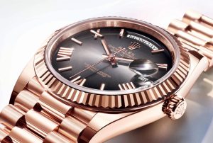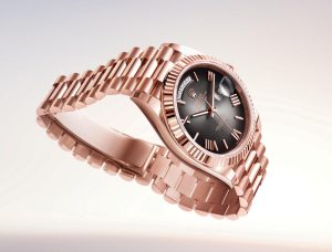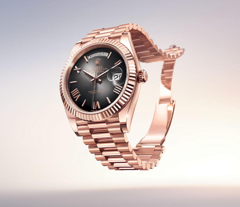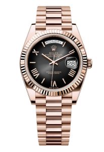 The new best replica Rolex Day-Date 40 watches in Everose gold (ref. 228235), with a slate ombré dial, is fitted with a three-link President bracelet in Everose gold, with polished centre links and satin-finished outer links with polished edges. It is closed with a signature concealed folding clasp in matching material