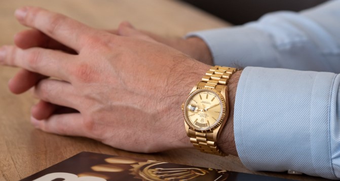 Mainly in the US, the Day-Date watch is often referred to as the “Rolex President”. Officially, “President” refers to the type of bracelet you see here, though the watch was also available on an Oyster bracelet. The “President” nickname also refers to the US Presidents who wore this watch. Where I live in the Netherlands, it’s more common to refer to it as Rolex Day-Date. Everyone will know which watch what you’re talking about.